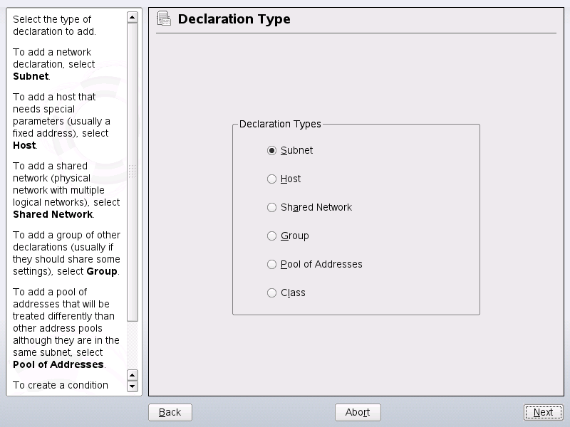 The of the DHCP server are made up of a number of declarations. This dialog lets you set the declaration types , , , , , and . This example shows the selection of a new subnetwork (see Figure 23-7).