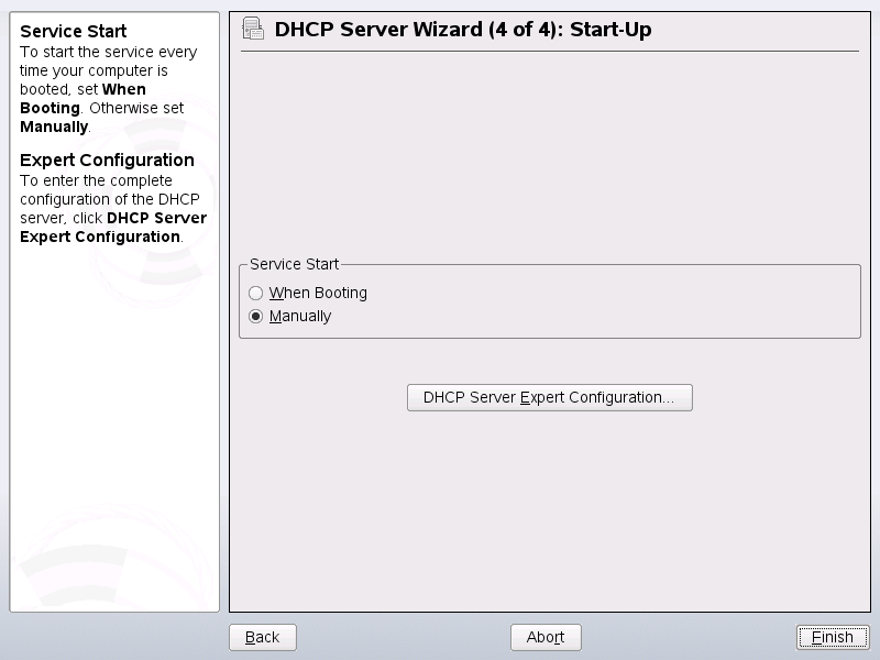 After the third part of the configuration wizard, a last dialog is shown in which you can define how the DHCP server should be started. Here, specify whether to start the DHCP server automatically when the system is booted or manually when needed (for example, for test purposes). Click to complete the configuration of the server. See Figure 23-4. Alternatively, you can select from the tree structure on the left to configure special host management features in addition to the basic configuration (see Figure 23-5).