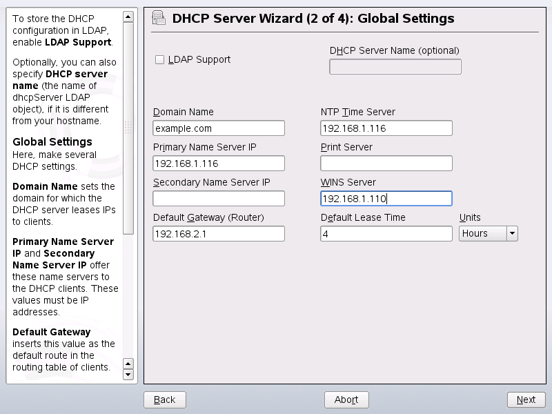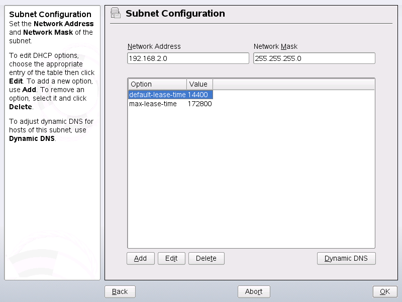 In this version of openSUSE, the YaST DHCP module can be set up to store the server configuration locally (on the host that runs the DHCP server) or to have its configuration data managed by an LDAP server. If you want to use LDAP, setup your LDAP environment before configuring the DHCP server.