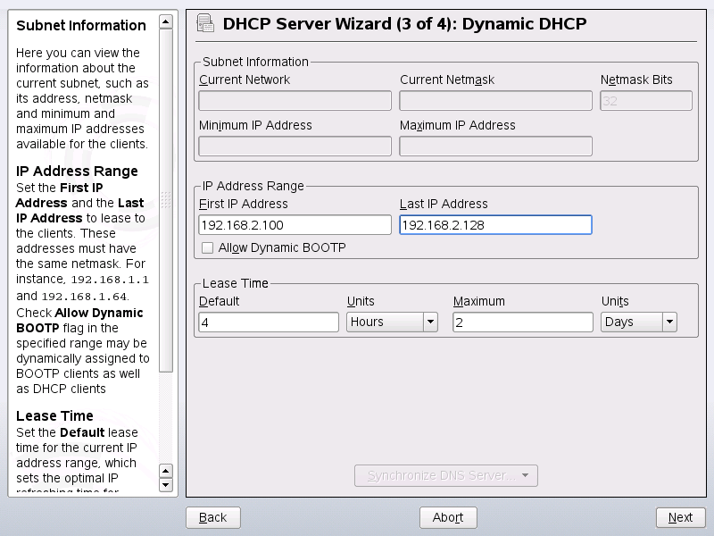 In this step, configure how dynamic IP addresses should be assigned to clients. To do so, specify an IP range from which the server can assign addresses to DHCP clients. All these addresses must be covered by the same netmask. Also specify the lease time during which a client may keep its IP address without needing to request an extension of the lease. Optionally, specify the maximum lease timeāthe period during which the server reserves an IP address for a particular client. See Figure 23-3.