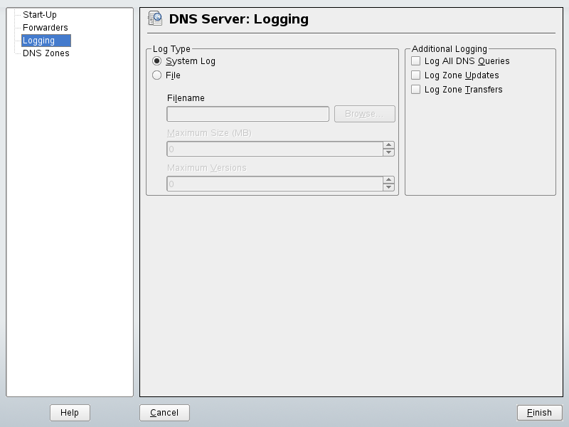 To set what the DNS server should log and how, select . Under , specify where the DNS server should write the log data. Use the systemwide log file /var/log/messages by selecting or specify a different file by selecting . In the latter case, additionally specify a name, the maximum file size in megabytes and the number of versions of log files to store.