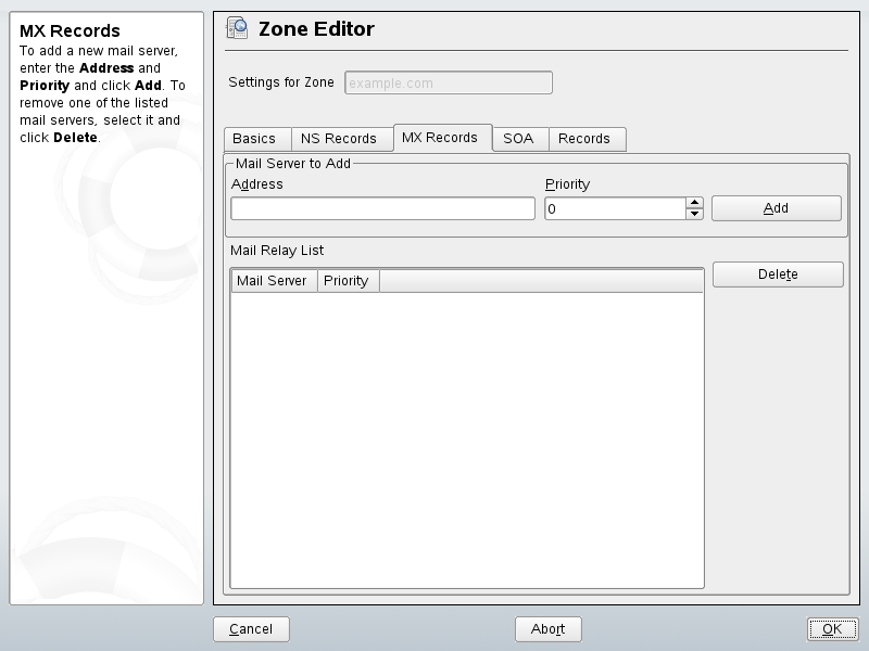 To add a mail server for the current zone to the existing list, enter the corresponding address and priority value. After doing so, confirm by selecting . See Figure 22-7.