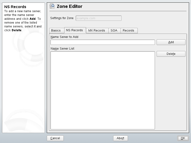 This dialog allows you to define alternative name servers for the zones specified. Make sure that your own name server is included in the list. To add a record, enter its name under then confirm with . See Figure 22-6.