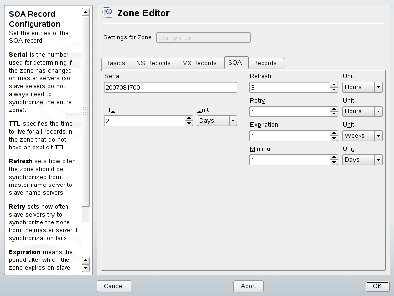 This page allows you to create SOA (start of authority) records. For an explanation of the individual options, refer to Example 22-6.