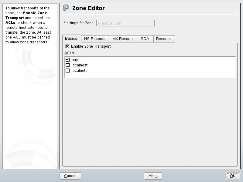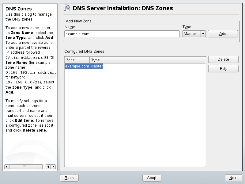 The dialog consists of several parts and is responsible for the management of zone files, described in Section 22.6, Zone Files. For a new zone, provide a name for it in . To add a reverse zone, the name must end in .in-addr.arpa. Finally, select the (master or slave). See Figure 22-2. Click to configure other settings of an existing zone. To remove a zone, click .