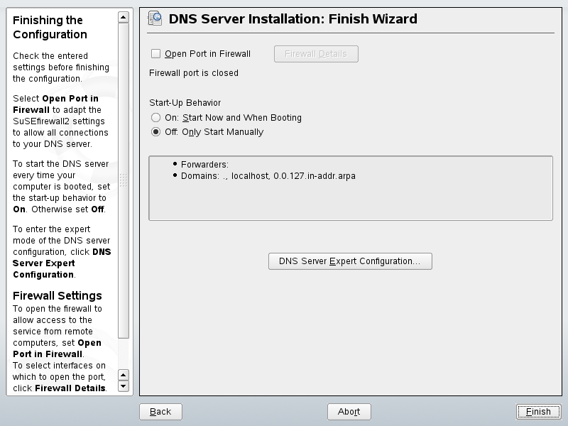 In the final dialog, you can open the ports for the DNS service in the firewall that is activated during the installation and decide whether DNS should be started. The expert configuration can also be accessed from this dialog. See Figure 22-3.