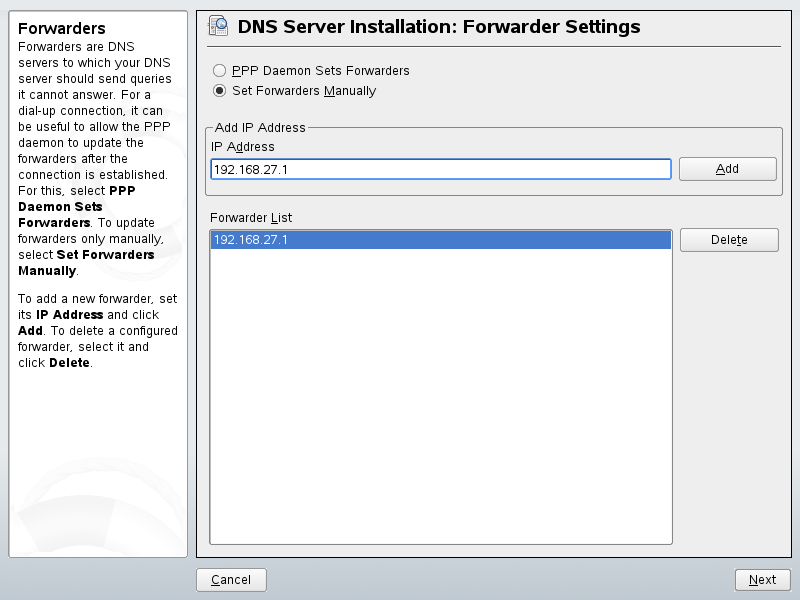When starting the module for the first time, the dialog, shown in Figure 22-1, opens. In it, decide whether the PPP daemon should provide a list of forwarders on dial-up via DSL or ISDN () or whether you want to supply your own list ().