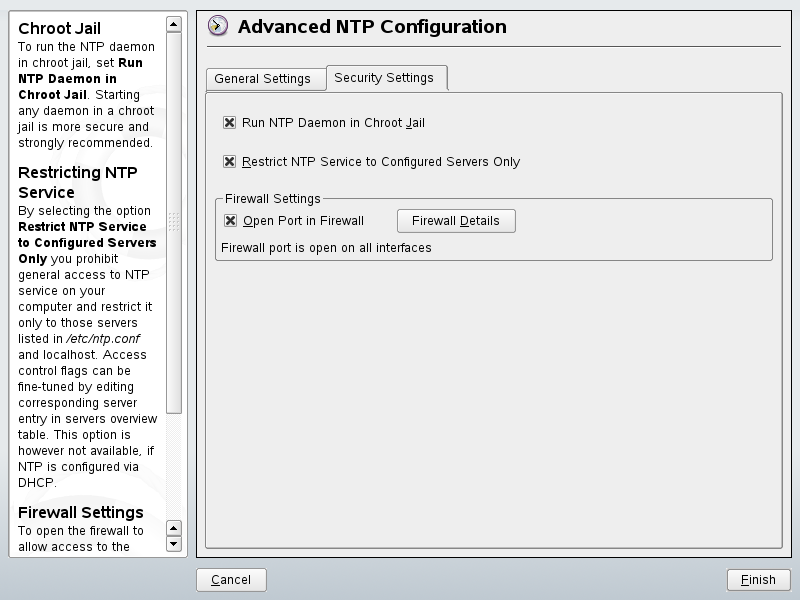 On the tab, determine whether xntpd should be started in a chroot jail. By default, is activated. This increases the security in the event of an attack over xntpd, because it prevents the attacker from compromising the entire system.