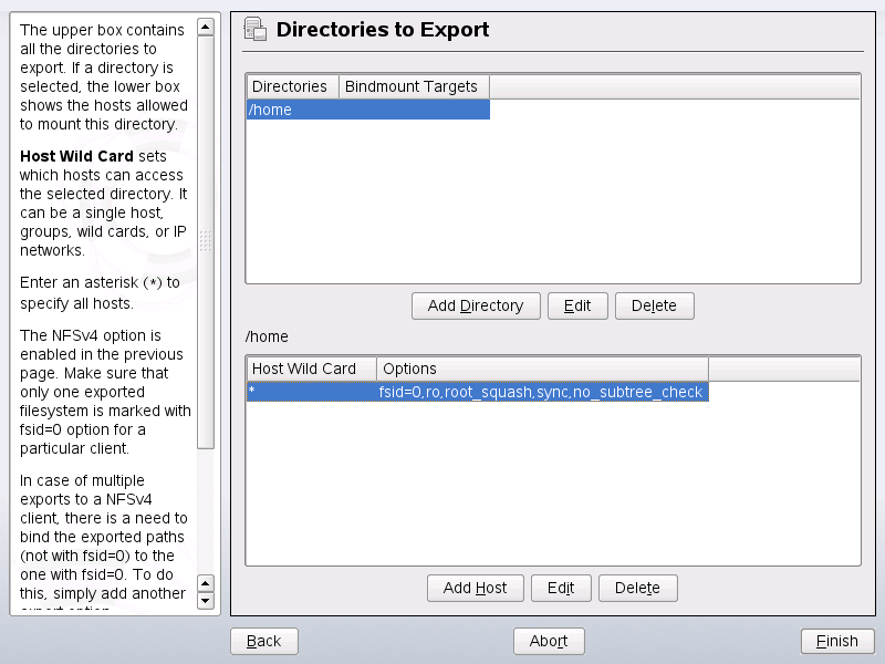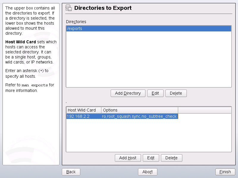 The next dialog has two parts. In the upper text field, enter the directories to export. Below, enter the hosts that should have access to them. There are four types of host wild cards that can be set for each host: a single host (name or IP address), netgroups, wild cards (such as * indicating all machines can access the server), and IP networks.