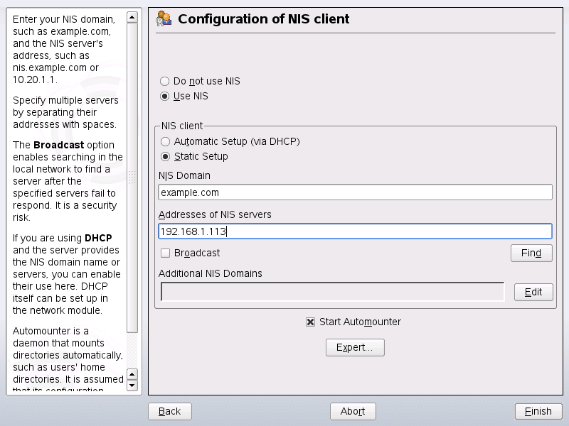Use the YaST module to configure a workstation to use NIS. Select whether the host has a static IP address or receives one issued by DHCP. DHCP can also provide the NIS domain and the NIS server. For information about DHCP, see Section 23.0, DHCP. If a static IP address is used, specify the NIS domain and the NIS server manually. See Figure 25-6. makes YaST search for an active NIS server in your whole network. Depending on the size of your local network, this may be a time-consuming process. asks for a NIS server in the local network after the specified servers fail to respond.