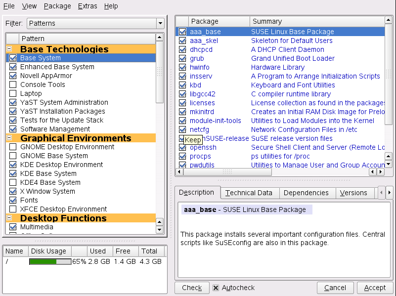 From the patterns select one or more patterns you are interested in. If you click on the name of a pattern, for example on , you see the packages it contains, in the right frame. If you activate it, the status markers at the beginning of the line will change: all packages get marked either with the status or . The meaning of all the symbols and of font color changes is explained in .