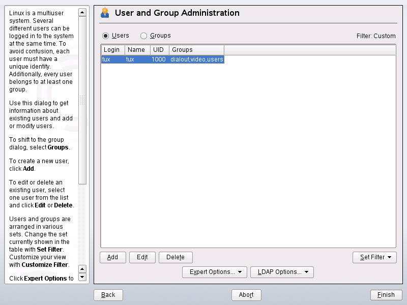 Every user is assigned a user ID (UID) which identifies him in the system. Apart from the users which can log in to your machine, there are also a number of system users for internal use only. Each user is assigned to one or more groups. Similar to system users, there are also system groups for internal use. For information about the Linux user and group concept, refer to Section 7.1, User Concept.
