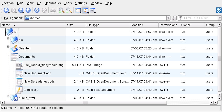 As shown in the third column, all objects belong to user tux. They are assigned to the group users which is the primary group the user tux belongs to. To retrieve the access permissions the first column of the list must be examined more closely. Let's have a look at the file kde-start.xml: