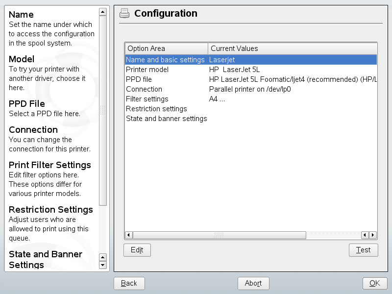 To make sure that everything works correctly, the crucial configuration steps can be checked with the print test function of YaST. The test page also provides important information about the configuration tested. If the output is garbled, for example, with several pages almost empty, you can stop the printer by first removing all paper then stopping the test from YaST.
