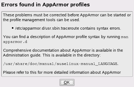 Using the AppArmor YaST tools, a graphical error message indicates which profile contained the error and requests you to fix it.