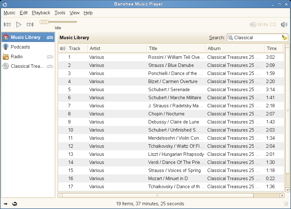 Banshee also has an integrated CD player. When you insert a music CD, your CD title appears in the left panel. Select the title and click the button to play your full CD.