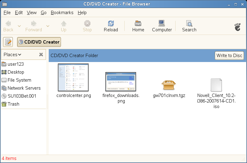 Copy the files you want to put on the CD or DVD into the Nautilus window.