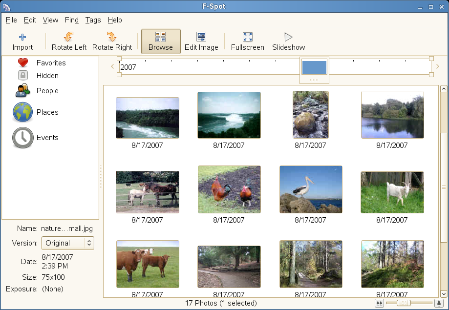 F-Spot is a management tool for your collection of digital images, tailored for the GNOME desktop. It allows you to assign different tags to your images in order to categorize them, and offers various image editing options. For example, you can remove red-eye, crop, and adjust brightness and colors. F-Spot supports all important image formats, including JPEG, PNG, TIFF, and several vendor specific RAW formats.