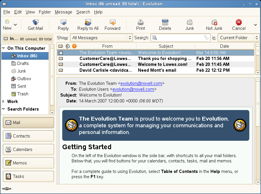 The first time you start it, Evolution prompts you with a few questions as it sets up a mail account and helps you import mail from your old mail client. It shows you how many new messages you have and lists upcoming appointments and tasks, as well as the current weather and news from news feeds. The calendar, address book, and mail tools are available in the shortcut bar on the left.