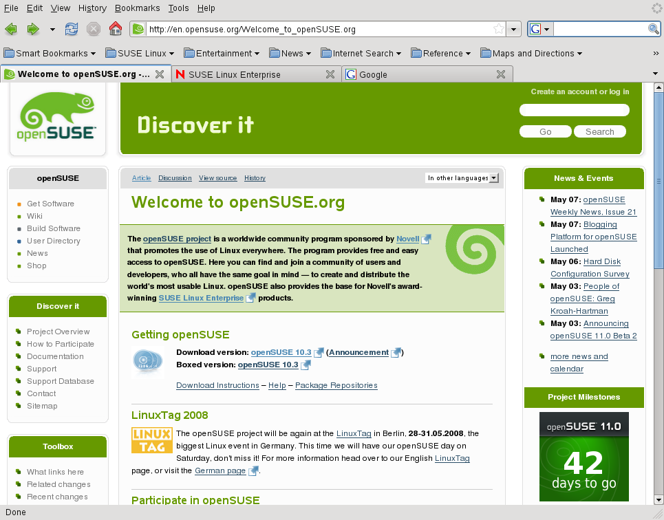 Apart from Konqueror (KDE's default Web browser), openSUSE also includes the Firefox Web browser. To start Konqueror or Firefox, press Alt+F2 and enter konqueror or firefox.