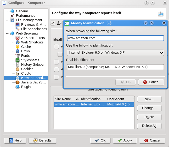 make Konqueror identify as a different browser (e.g. Internet