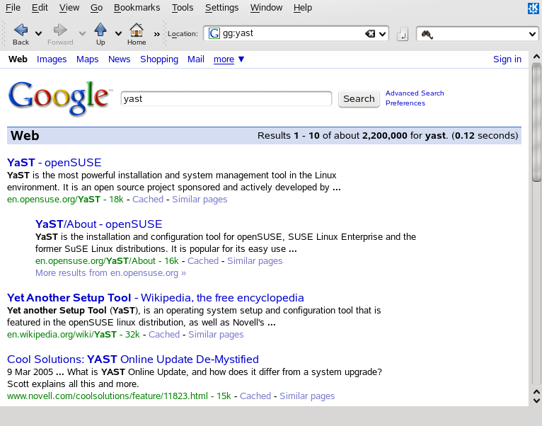 Konqueror offers Web shortcuts for quickly searching the Web. For example, to search the Web for yast using the Google search engine, just type gg:yast into the Konqueror location bar (or the dialog) and press Enter.