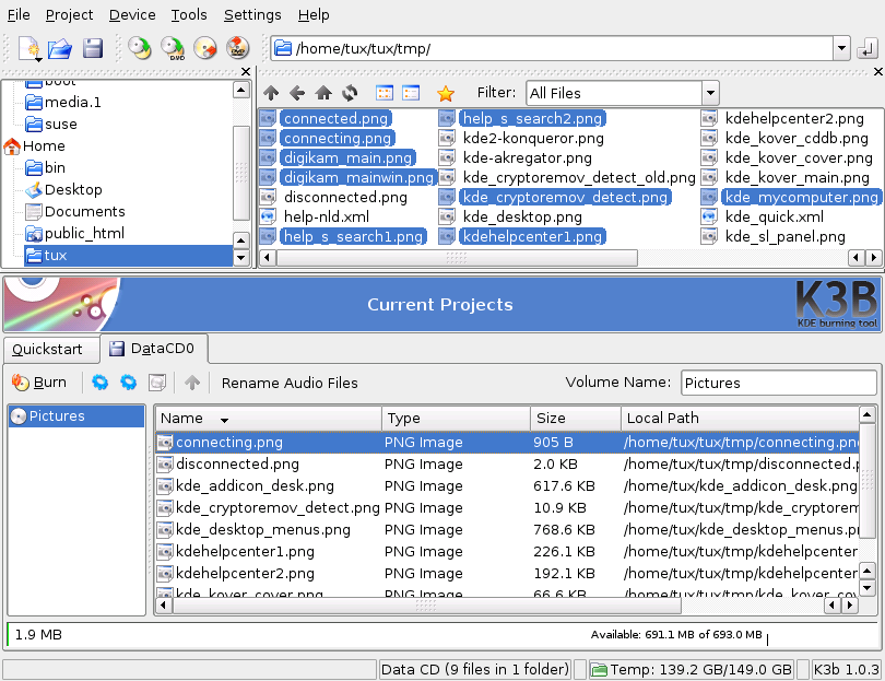 If you possess a CD or DVD writer, you can burn files to a CD or DVD with K3b.