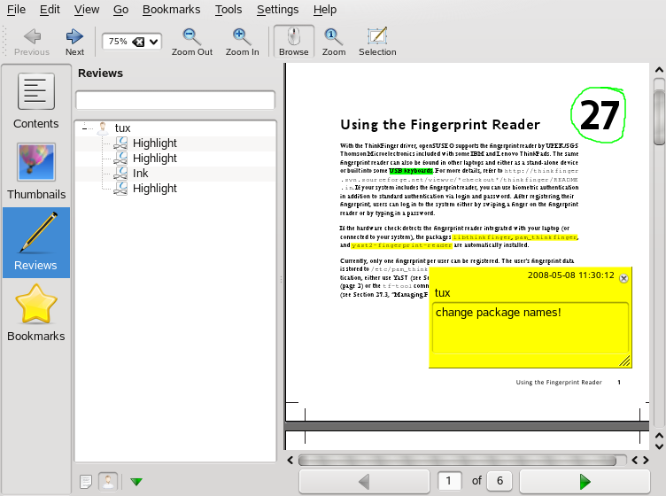 With Okular, you can review a document by highlighting certain text parts or adding annotations or bookmarks that Okular then attaches to the file in form of metadata. Note that the annotations and markers you add are not stored within the document, so you cannot print them or pass them on to other users.