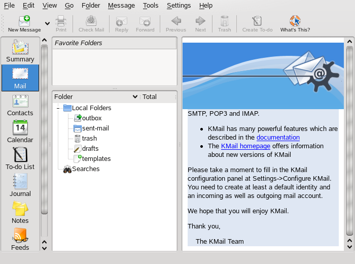 For reading and managing your mails and appointments, you can use Kontact as your personal information management tool (PIM). Kontact combines KDE applications like KMail, KOrganizer, and KAddressBook into a single interface. This gives you easy access to your e-mail, calendar, address book, and other PIM functionality. Kontact can also manage multiple e-mail accounts, such as your private e-mail and your business ones. Kontact is not yet available as a KDE 4 application, but you can use the KDE 3 version of Kontact on your KDE 4 desktop.