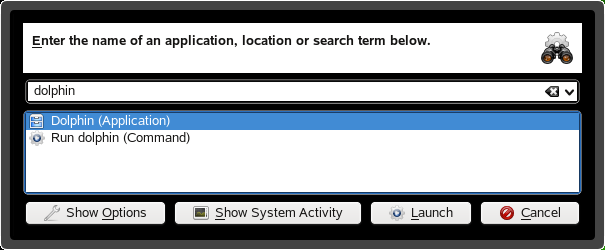 KRunner is a helper application with lets you quickly start programs. Apart from that, it offers a search function for finding applications or locations.