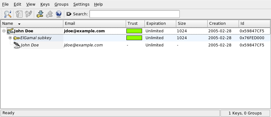 When you start KGpg in later sessions, only a small icon with a padlock appears in the system tray. Click that icon to display the main KGpg window on your desktop.