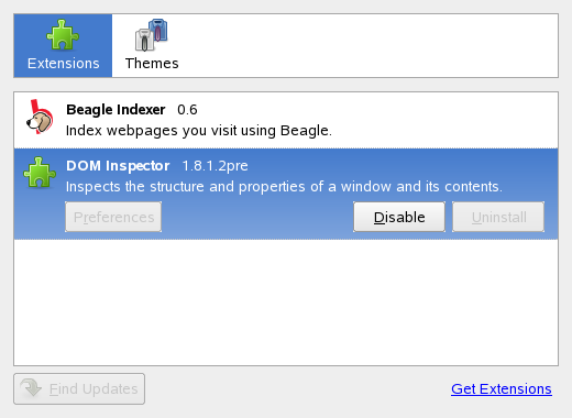 Extensions let you personalize Firefox to exactly fit your needs. With the help of extensions you can change Firefox's look and feel, enhance existing functionality (such as the download manager or tabbed browsing) or add functions such as a Web log editor, Bit Torrent support or even a music player. Certain extensions also assist Web developers while others increase security by dynamically blocking active contents. More than 1000 extensions are available for Firefox. With the add-ons manager you cannot only install new extensions, but also disable, enable, or delete them. It also finds updates to installed extensions.