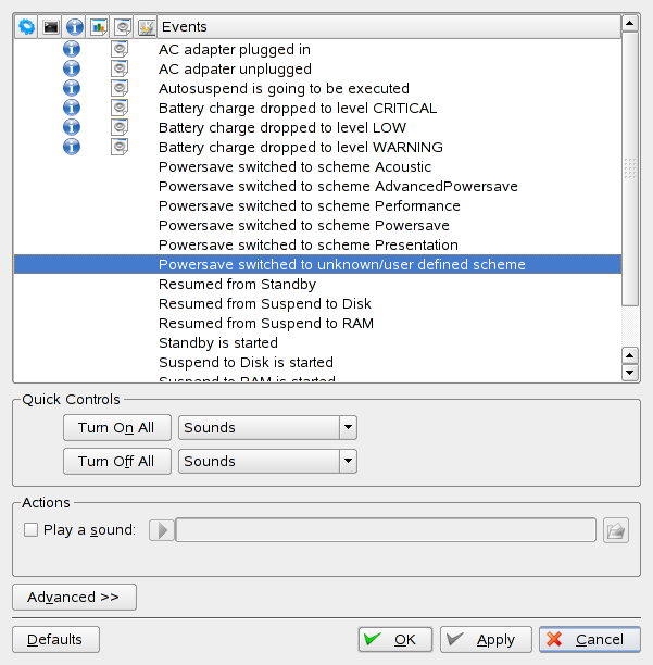 Basically, there are two different ways to configure KPowersave notifications. Either use the to toggle the notification status of multiple events at once or use the settings to configure them one by one.