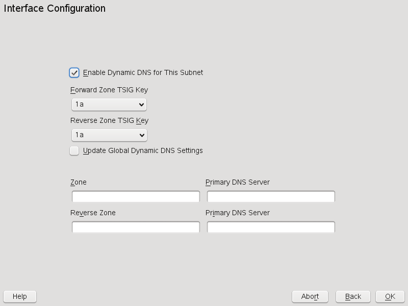 You can now activate dynamic DNS for the subnet by selecting . After doing so, use the drop-down list to choose the TSIG keys for forward and reverse zones, making sure that keys are the same for the DNS and the DHCP server. With , enable the automatic update and adjustment of the global DHCP server settings according to the dynamic DNS environment. Finally, define which forward and reverse zones should be updated per dynamic DNS, specifying the name of the primary name server for each of the two zones. If the name server runs on the same host as the DHCP server, you can leave these fields blank. Selecting returns to the subnet configuration dialog (see Figure 17-8). Selecting again returns to the original expert configuration dialog.