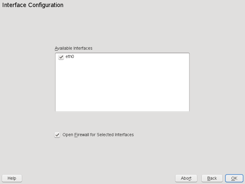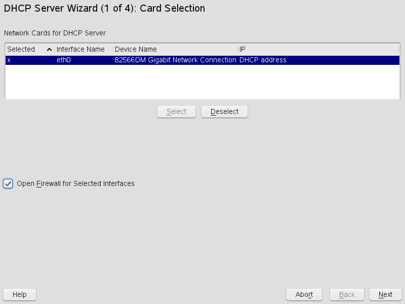 In the first step, YaST looks for the network interfaces available on your system then displays them in a list. From the list, select the interface on which the DHCP server should listen and click . After this, select to open the firewall for this interface. See Figure 17-1.