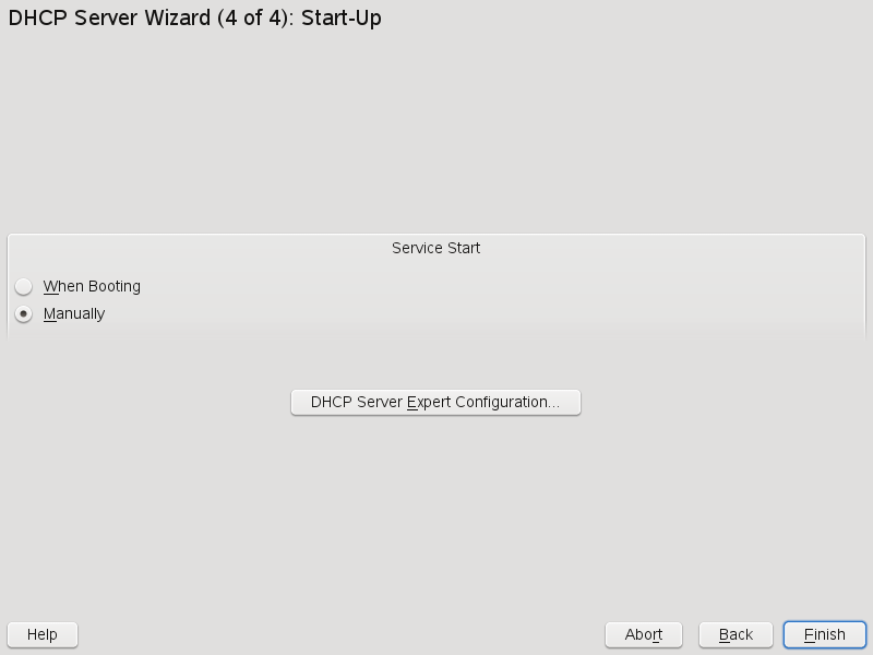 After the third part of the configuration wizard, a last dialog is shown in which you can define how the DHCP server should be started. Here, specify whether to start the DHCP server automatically when the system is booted or manually when needed (for example, for test purposes). Click to complete the configuration of the server. See Figure 17-4. Alternatively, you can select from the tree structure to the left to configure special host management features in addition to the basic configuration (see Figure 17-5).