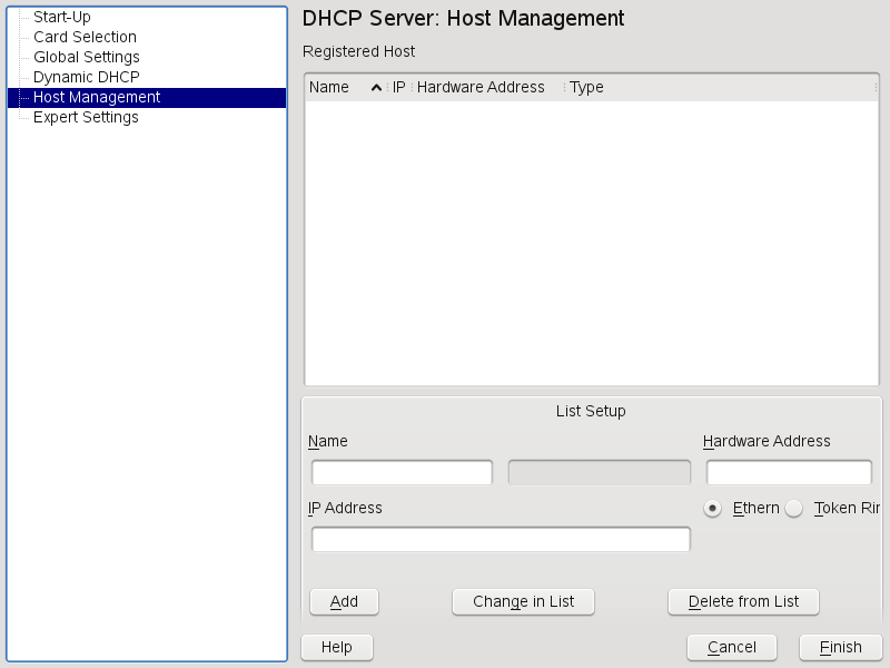 The YaST DHCP module allows you to set up your own DHCP server for the local network. The module can run in simple mode or expert mode.