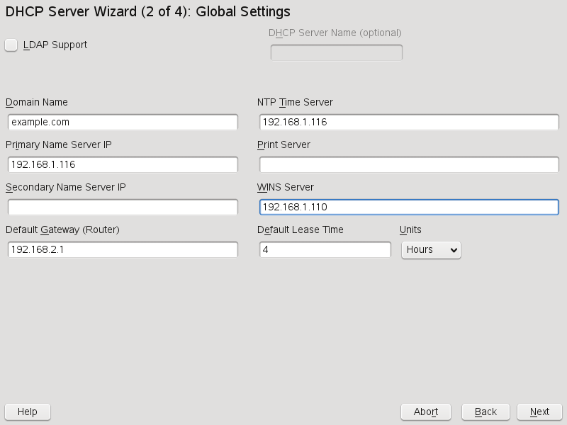 Use the check box to determine whether your DHCP settings should be automatically stored by an LDAP server. In the entry fields, provide the network specifics for all clients the DHCP server should manage. These specifics are the domain name, address of a time server, addresses of the primary and secondary name server, addresses of a print and a WINS server (for a mixed network with both Windows and Linux clients), gateway address, and lease time. See Figure 17-2.