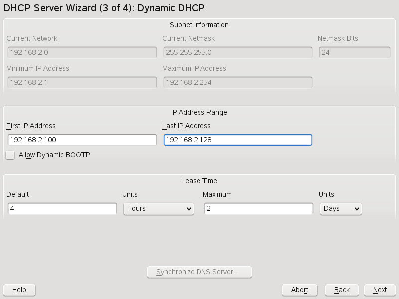 In this version of openSUSE, the YaST DHCP module can be set up to store the server configuration locally (on the host that runs the DHCP server) or to have its configuration data managed by an LDAP server. If you want to use LDAP, setup your LDAP environment before configuring the DHCP server.