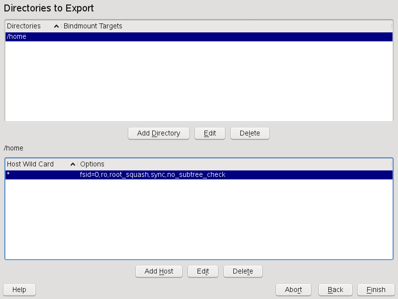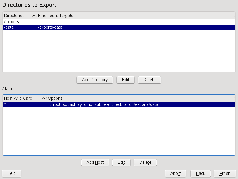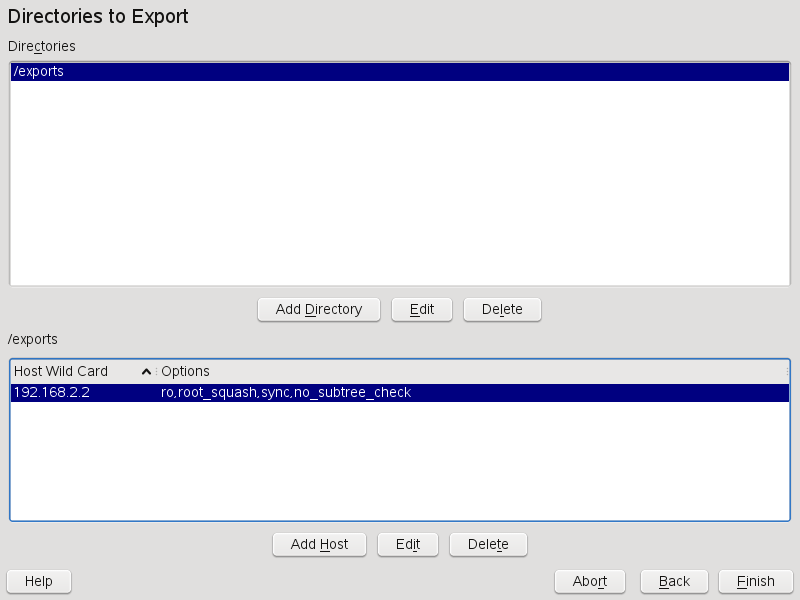 The next dialog has two parts. In the upper text field, enter the directories to export. Below, enter the hosts that should have access to them. There are four types of host wild cards that can be set for each host: a single host (name or IP address), netgroups, wild cards (such as * indicating all machines can access the server), and IP networks.