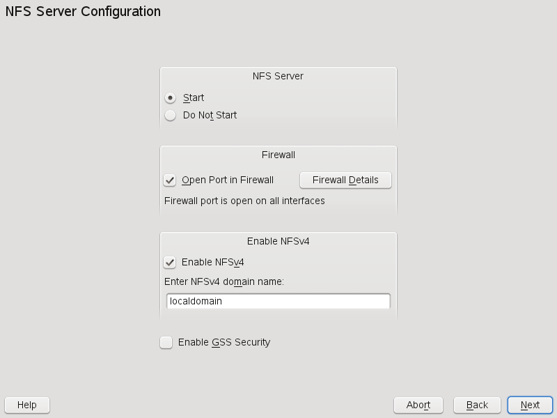 After activating NFSv4, enter an appropriate domain name. Make sure that the name entered is the same as the one present in the /etc/idmapd.conf file of any NFSv4 client that accesses this particular server. This parameter is for the idmapd service that is required for NFSv4 support (on both server and client). Leave it as localdomain (the default) if you do not have special requirements. For more information, see Section 21.7, For More Information.