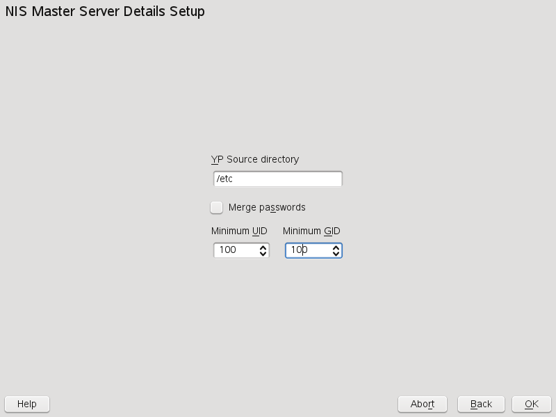 Leave this dialog with or click to make additional settings. include changing the source directory of the NIS server (/etc by default). In addition, passwords can be merged here. The setting should be so the files (/etc/passwd, /etc/shadow, and /etc/group) are used to build the user database. Also determine the smallest user and group ID that should be offered by NIS. Click to confirm your settings and return to the previous screen.