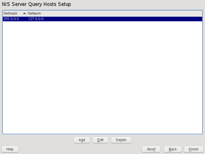 Enter the hosts that are allowed to query the NIS server. You can add, edit, or delete hosts by clicking the appropriate button. Specify from which networks requests can be sent to the NIS server. Normally, this is all hosts. In this case, there should be the following two entries: