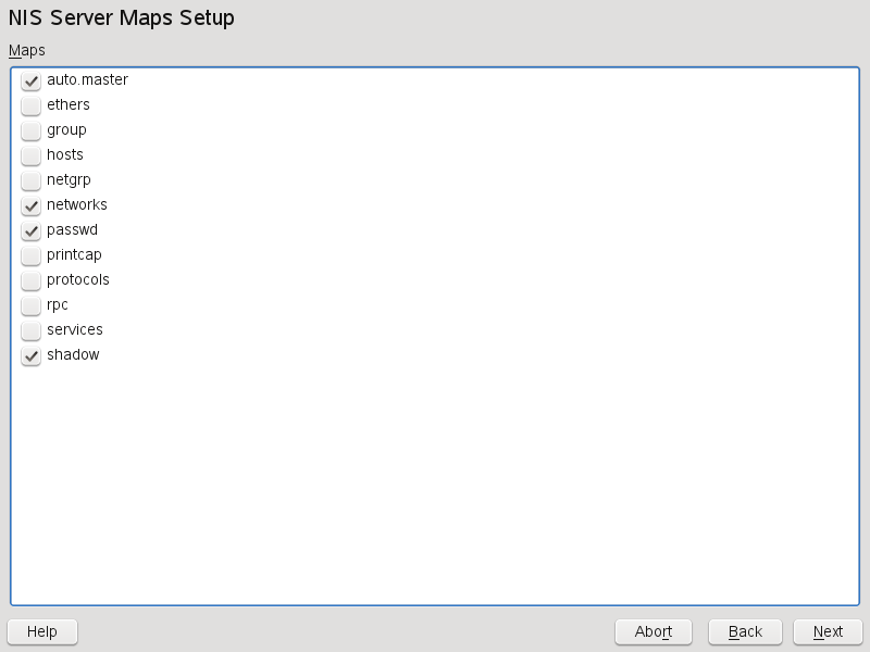 If you do not use slave servers, the slave configuration is skipped and you continue directly to the dialog for the database configuration. Here, specify the maps, the partial databases to transfer from the NIS server to the client. The default settings are usually adequate. Leave this dialog with .