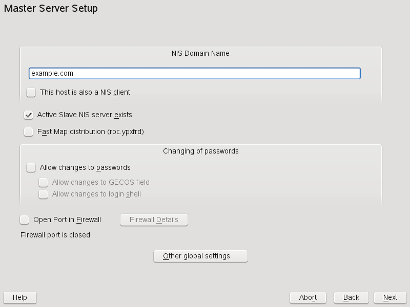 If your NIS master server should export its data to slave servers, set up the master server as described in Section 19.1.1, Configuring a NIS Master Server and set up slave servers in the subnets as described in Section 19.1.2, Configuring a NIS Slave Server.