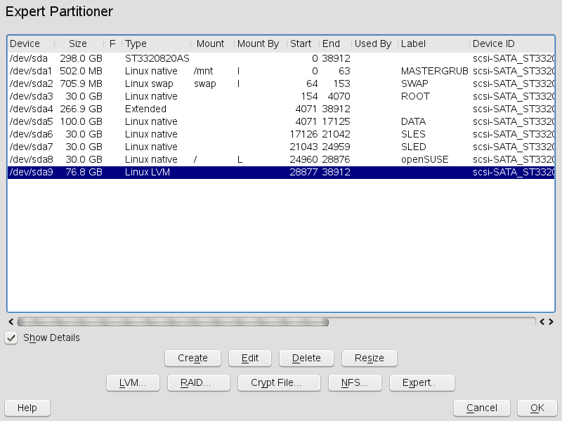 With the expert partitioner, shown in Figure 2-1, manually modify the partitioning of one or several hard disks. Partitions can be added, deleted, resized, and edited. Also access the soft RAID and LVM configuration from this YaST module.