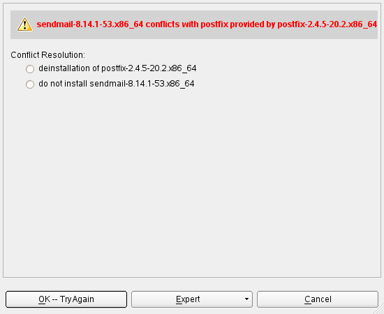 For example, sendmail and postfix may not be installed concurrently. Figure 3-1 shows the conflict message prompting you to take a decision. postfix is already installed. Accordingly, you can refrain from installing sendmail, remove postfix, or take the risk and ignore the conflict.