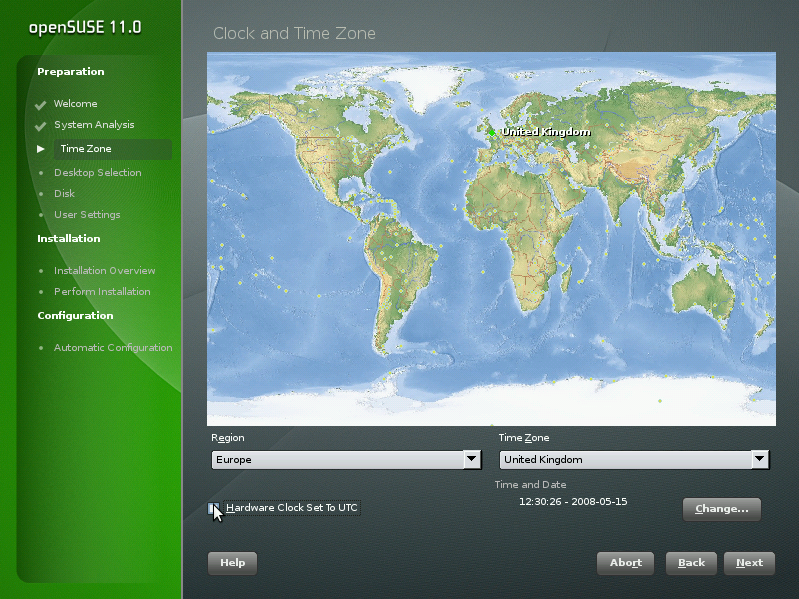 To set up the clock, choose between and (GMT) for . If you run another operating system on your machine, such as Microsoft Windows*, it is likely your system uses . If you only run Linux on your machine, set the hardware clock to UTC and have the switch from standard time to daylight saving time performed automatically. Click to set the current date and time.