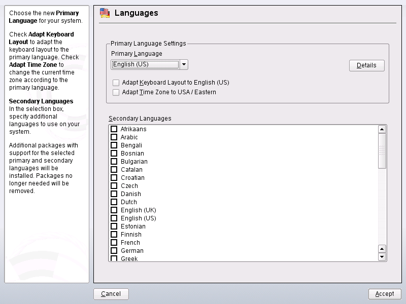 The main language was selected during installation (see Section 1.6, Welcome) and keyboard and time zone settings were adjusted. However, you can install additional languages on your system and determine which of the different languages installed should be taken as the default. Before installing additional languages, determine which of them should be activated after you install it. YaST knows two different language categories: