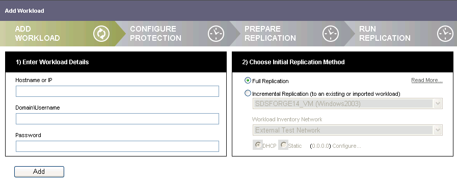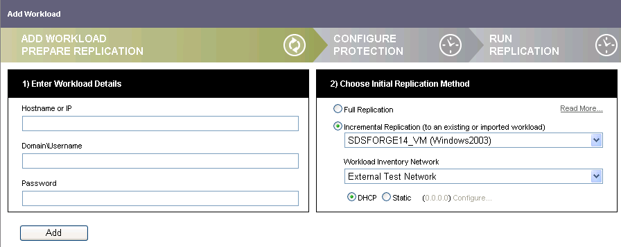 You have the option of adding a workload that uses full replication or adding an existing or imported workload and running incremental replications to save time and bandwidth. When incremental replication is selected, the and steps of the Add Workload Wizard at the top of the Add Workload page are combined so that there are only three steps to the procedure.